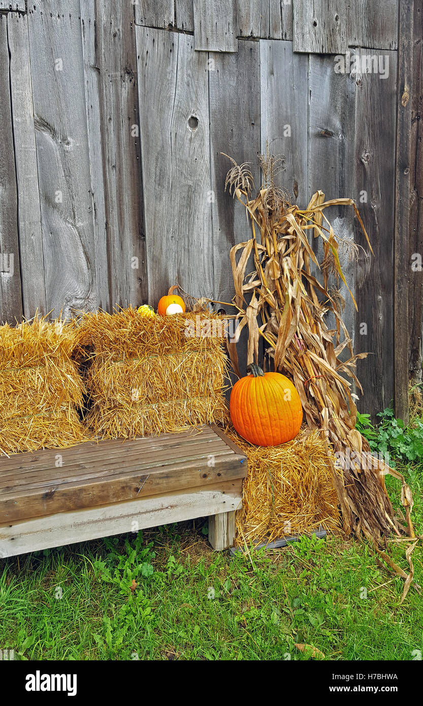 Autumn Pumpkins On Hay Bales By Wooden Bench And Barn Stock Photo Alamy